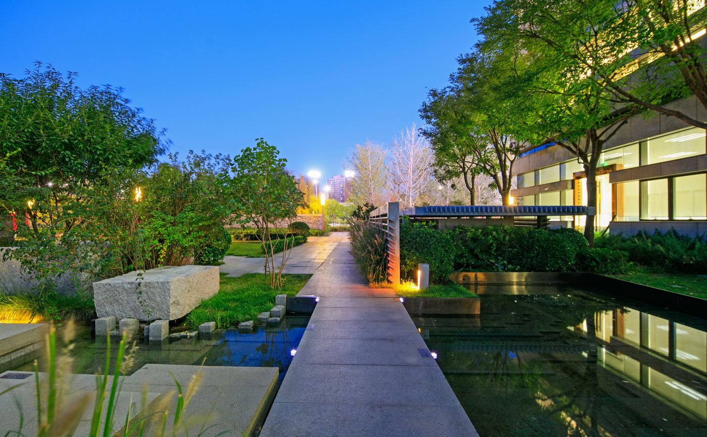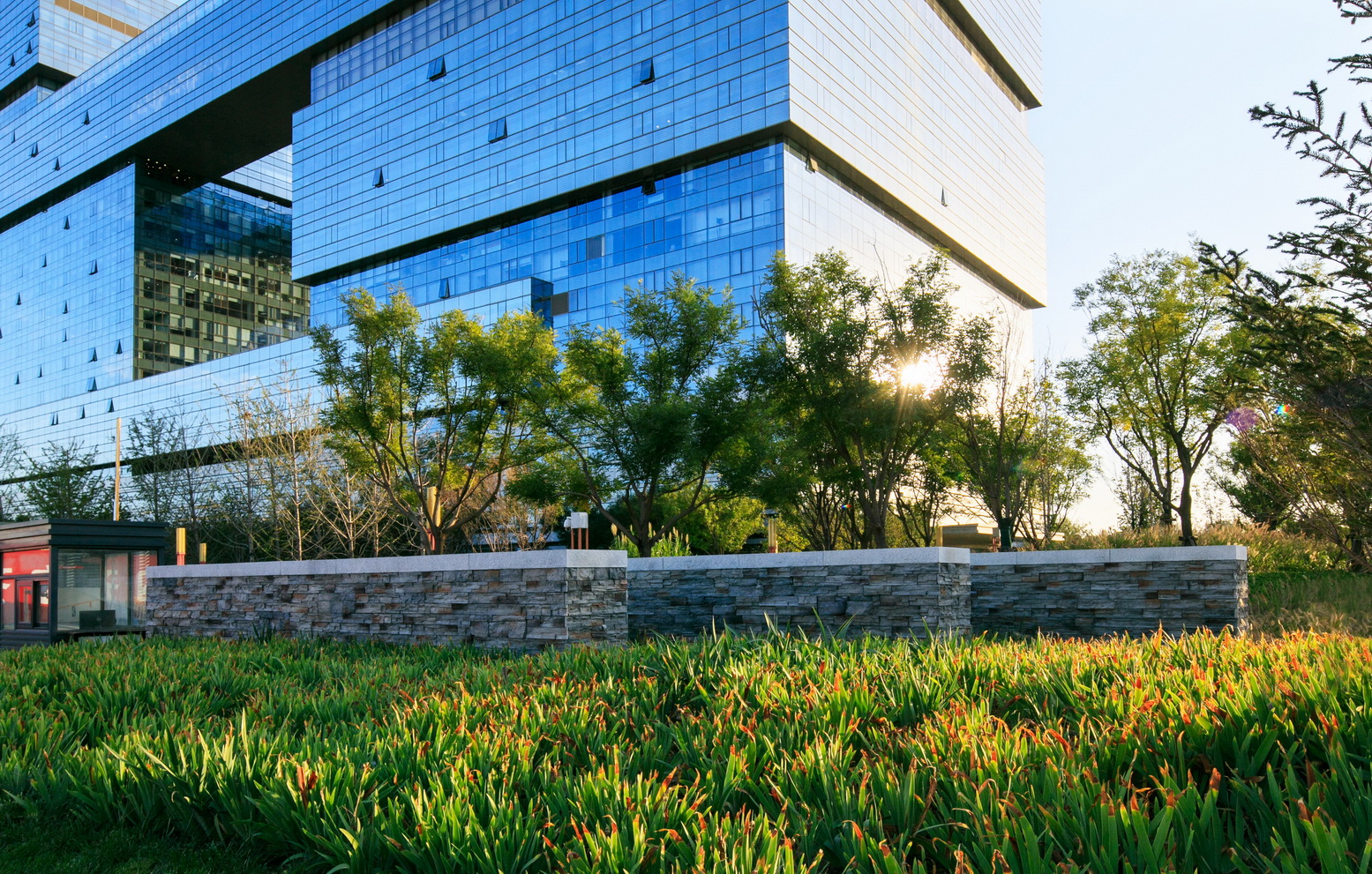 北京京東集團總部為京東集團總部辦公樓,項目應(yīng)用野草、整石等營造野趣又簡約大氣的辦公空間。項目工程采用了新工藝—不銹鋼鋼絲影壁,其邊框為碳化拉絲不銹鋼。影壁施工中多次與設(shè)計甲方溝通,實地做樣板,為了更好的營造景觀,最后將原來的亞克力板改為不銹鋼鋼絲繩。以片植竹子為背景的影壁在陽光或燈光照射下效果極富意境。在辦公人員休息活動區(qū)域,具有項目特色的紅菠蘿格木椅,點綴飄逸的觀賞草,既是休息之處亦是觀賞之景,充滿意趣。